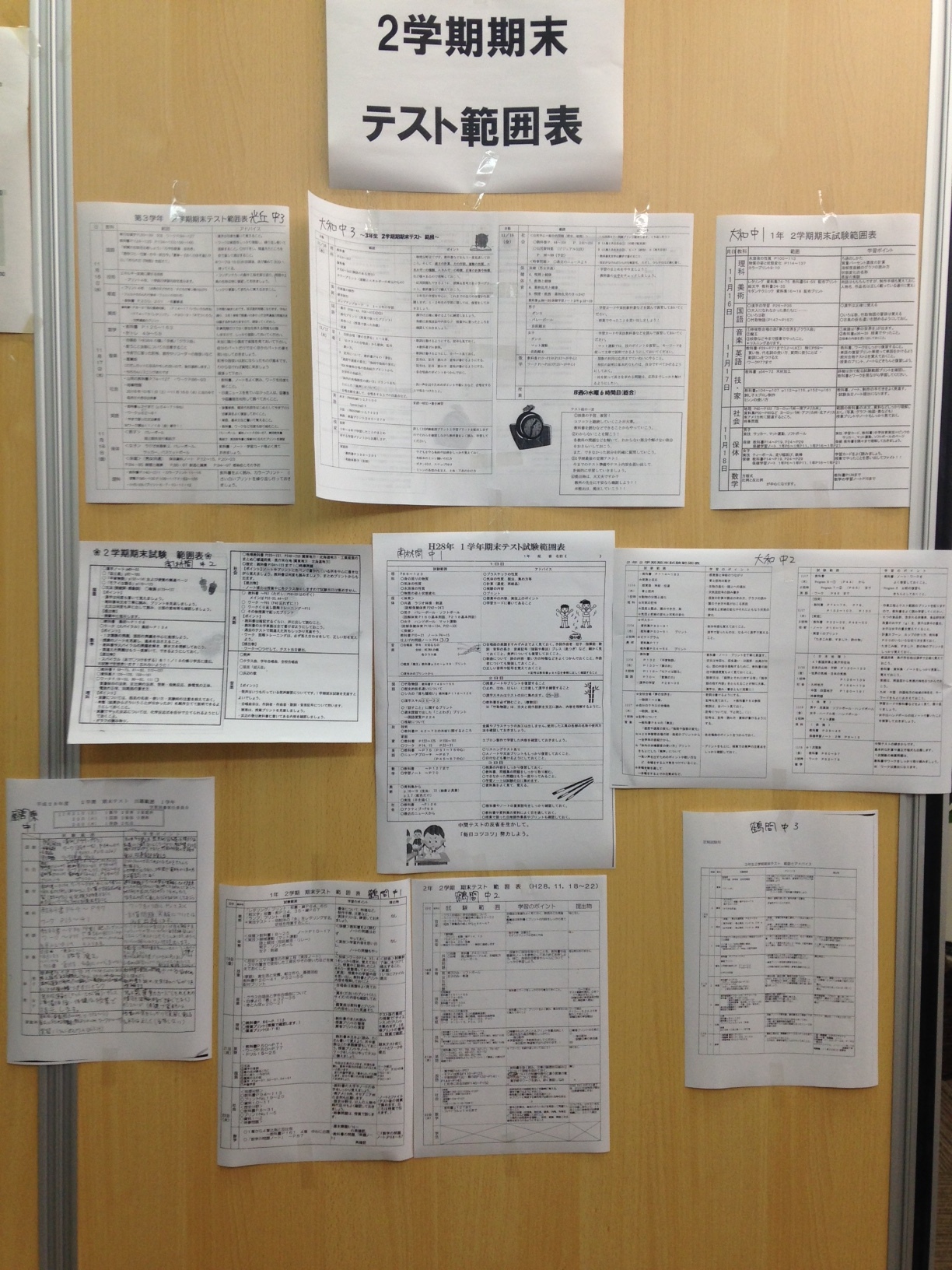 エクセルシア南林間校の教室内、今のところあまり掲示物を多く貼っていないのですが、テストに向けて少しでも意識を持ってもらうため、範囲をすぐに確認できるようにするために、テスト前には各中学校のテスト範囲表を掲示するようにしています。