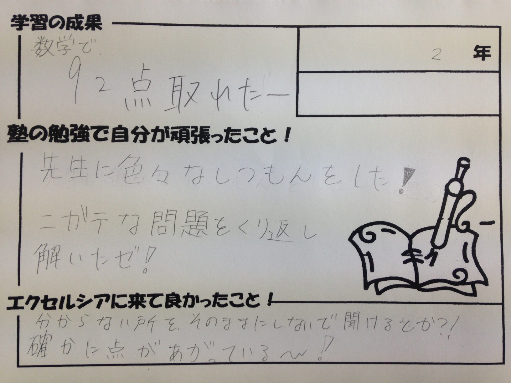 先日の中間テストの結果が特に良かった生徒さんに、喜びの声を書いてもらっています。